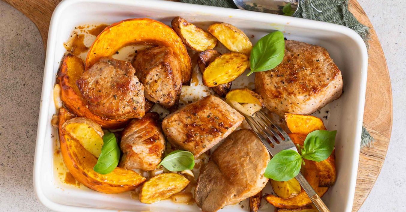 Maso dejte do zapékací mísy. Pod něj dejte plátky másla a okolo rozložte zeleninu. Podlijte vodou, zakryjte poklicí a pečte 1,5 hodiny nebo doměkka v troubě vyhřáté na 230 °C.