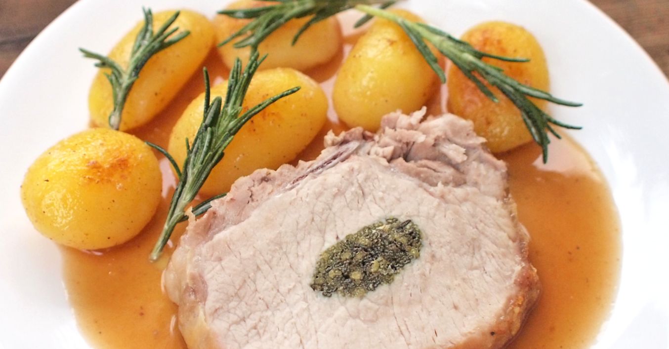 Vepřovou pečeni očistíme a pomocí dlouhého nože vytvoříme skrze celou pečeni díru, kterou naplníme celým svazkem rozmarýnu. Pečeni opepříme, osolíme a svážeme řeznickým provázkem s mezerami asi 2 cm.