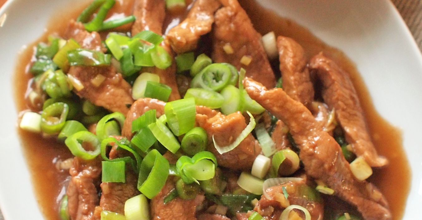 Jarní cibulku očistíme a nakrájíme na tenká kolečka. Zázvor oloupeme, podrtíme a nasekáme nadrobno. Česnek oloupeme, podrtíme a také nasekáme nadrobno. Vepřovou kýtu očistíme a nakrájíme na tenké nudličky, které osolíme a opepříme.