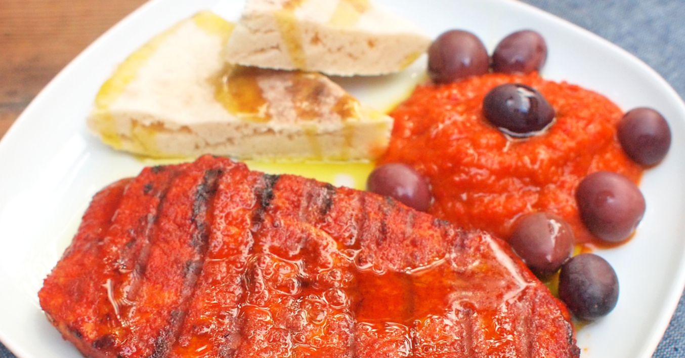 Vepřové steaky zbavíme přebytečné marinády a grilujeme je na rozehřátém grilu z obou stran. Nejprve prudčeji na přímém žáru, abychom získali otisk mřížky. Poté je přeneseme na nepřímý žár a dopečeme (dohromady asi 10 až 15 minut). Po upečení steaky zakryjeme a necháme asi 5 minut v klidu odpočinout. Poté podáváme spolu s paprikovým pyré.