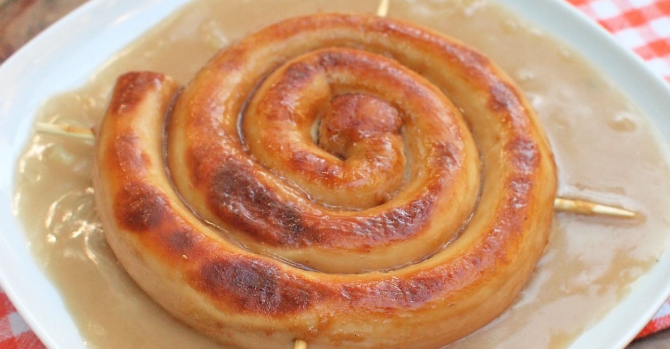 Mezitím si vinnou klobásu rozmotáme a rozdělíme na stejně dlouhé díly. Každý díl pak stočíme do spirály a tu zajistíme špejlemi do kříže.