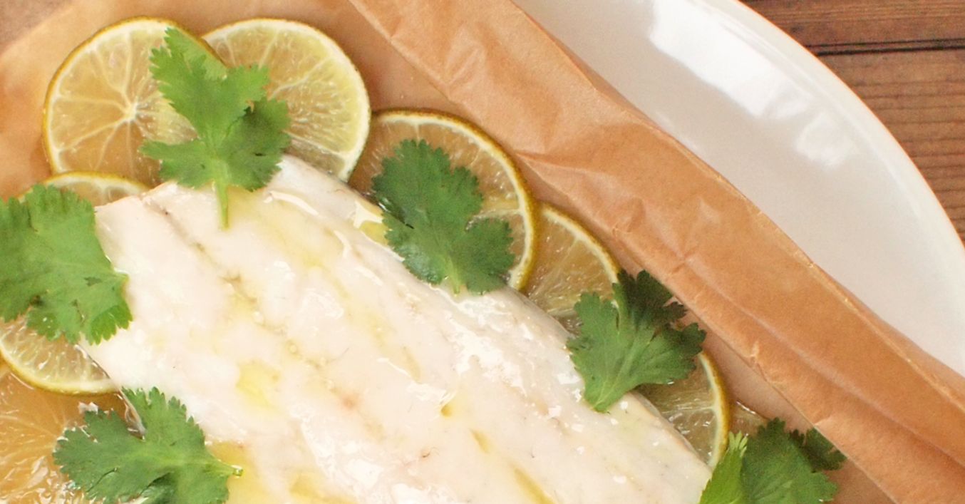 Připravíme si alobal nebo pečicí papír, který vysteleme plátky limetek. Přidáme zázvor, citronovou trávu a filety z mořského vlka. Osolíme a zalijeme olivovým olejem. Opatrně zabalíme a svážeme provázkem.