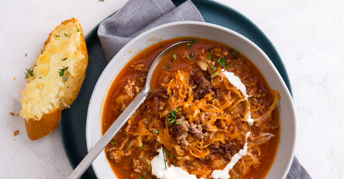 Vydatná polévka s kysaným zelím a sýrovou bagetou