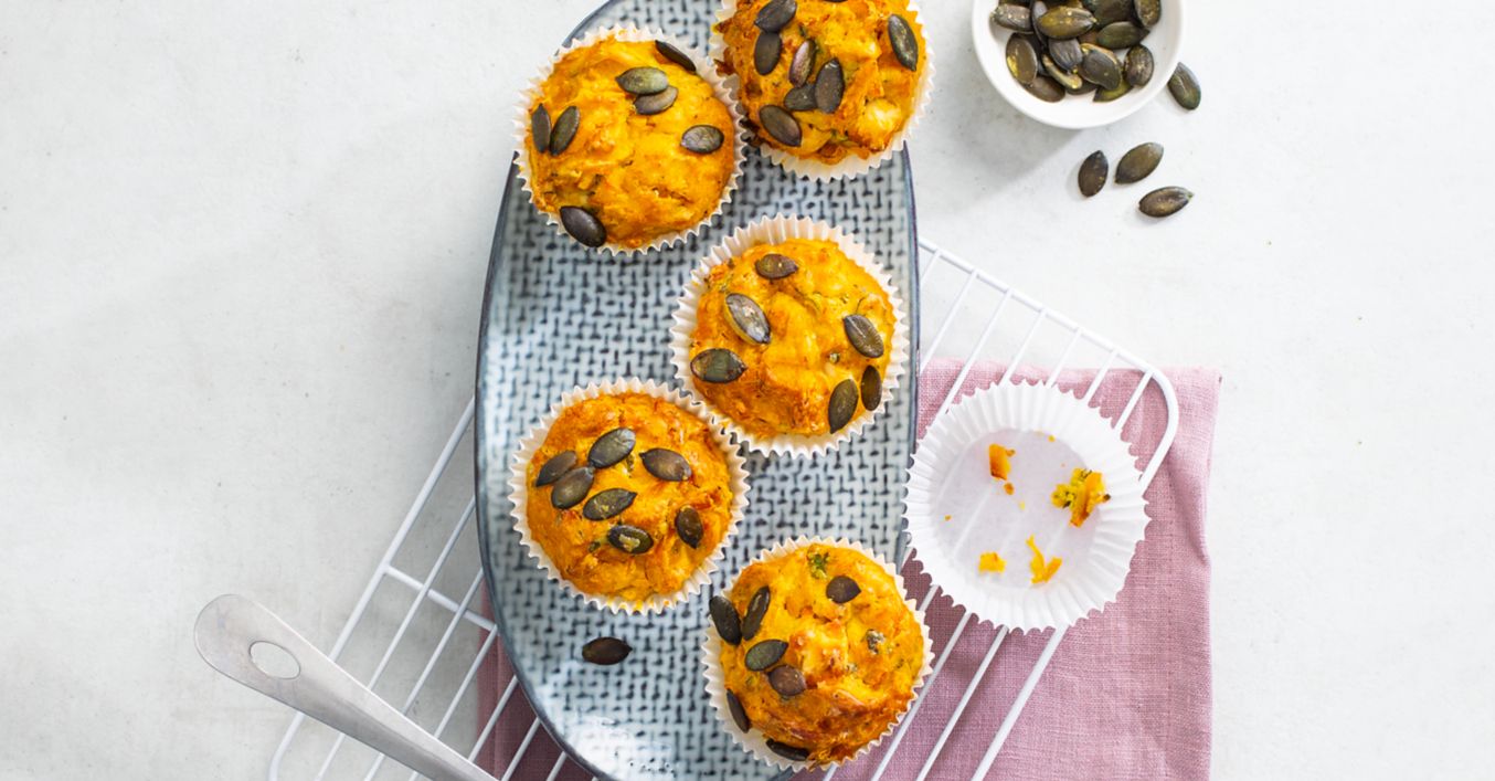 Ve velké míse smícháme mouku a prášek do pečiva. Přidáme vejce, hořčici, smetanový sýr, oregano, majoránku, olivový olej a petrželku a rozmixujeme. Osolíme a opepříme. Rozdrtíme fetu a přidáme ji k dýňi. Plech na muffiny vyložíme košíčky, naplníme je do ¾ těstem, posypeme dýňovými semínky a pečeme asi 20-25 minut dozlatova.