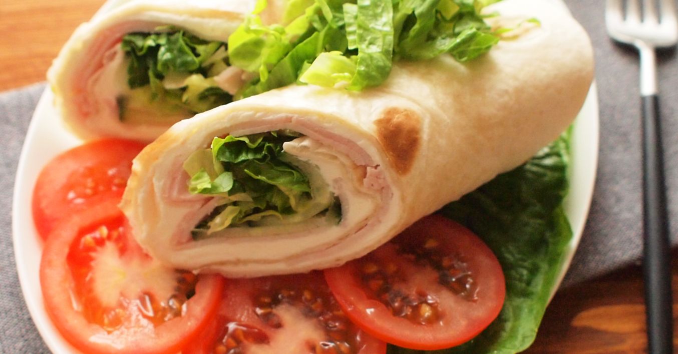 Tortilly potřeme lučinou a zasypeme pažitkou. Přidáme šunku, okurku, salát a zabalíme.