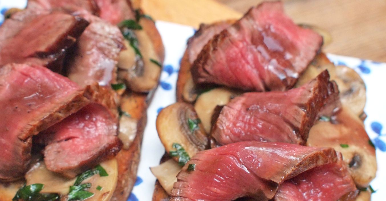 Hotové steaky vyndáme z trouby a necháme je chvíli odpočinout. Poté je nakrájíme na tenké šikmé plátky a spolu se žampiony obložíme na topinky. Přidáme čerstvě mletý pepř a podáváme.
