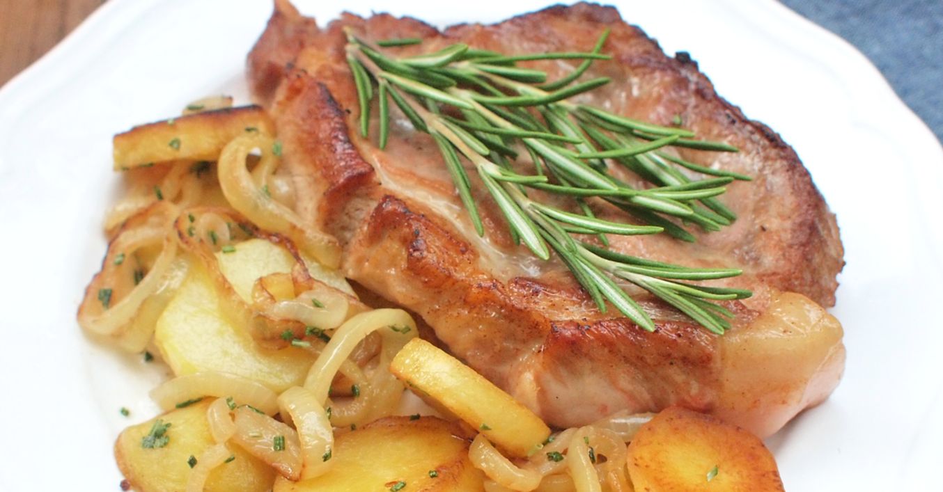 Brambory oloupeme a nakrájíme na tenké plátky. Cibuli oloupeme a také nakrájíme na plátky. Krkovici očistíme, osušíme a dlaní mírně naklepeme. Z obou stran dobře osolíme a opepříme. Rozmarýn nadrobno nasekáme.
