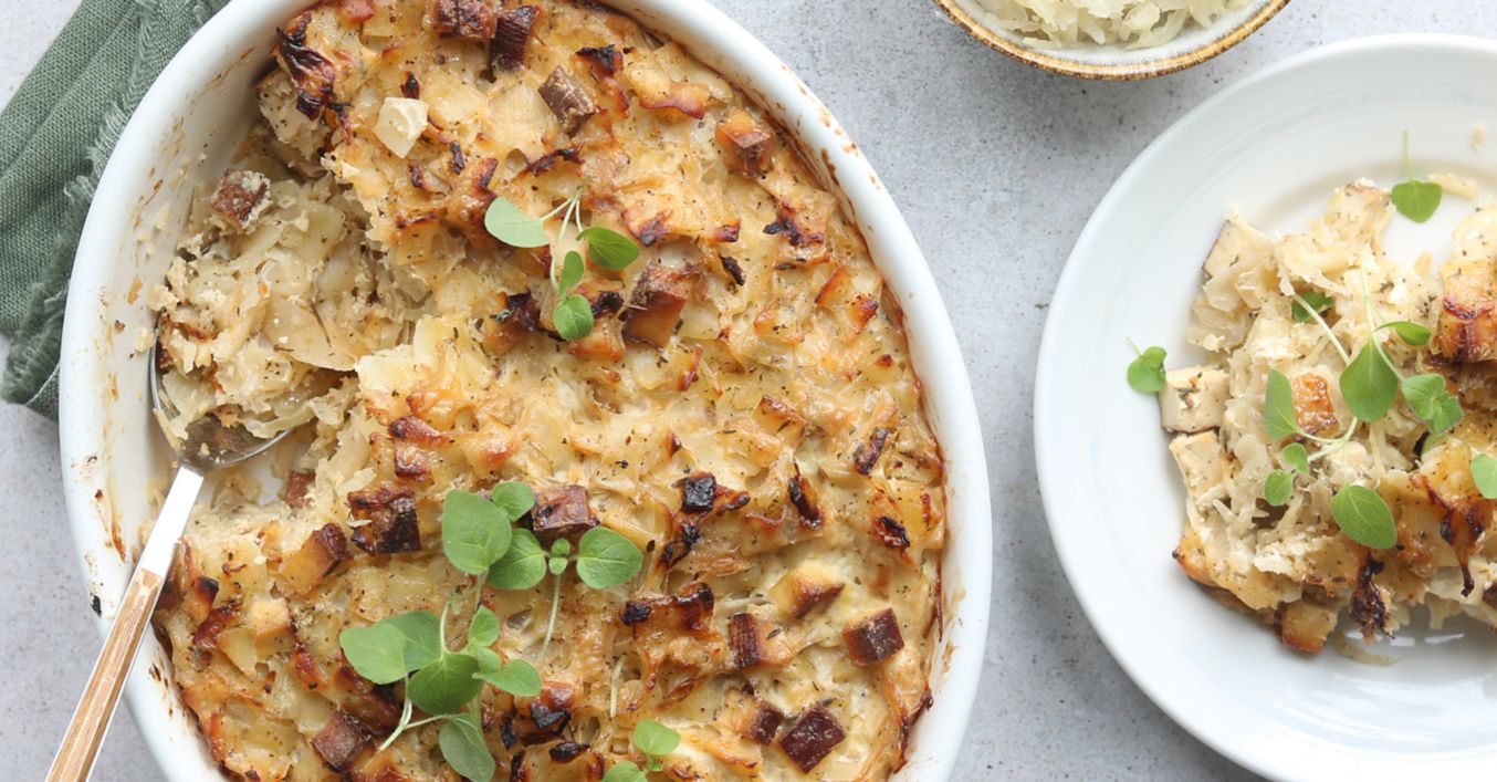 Uzené maso nakrájejte na kostičky. Promíchejte s těstovinami a kysaným zelím. Pak přesuňte do zapékací mísy vytřené olejem.