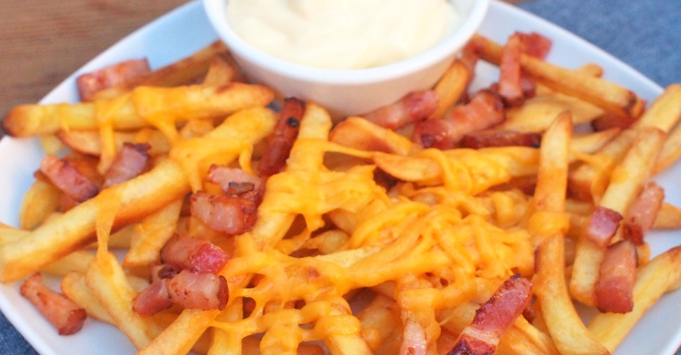 Předpečené hranolky poté rozdělíme na porce, zasypeme sýrem a vrátíme do trouby asi na 5 minut, dokud se sýr nerozteče. Přidáme slaninu a ihned podáváme.