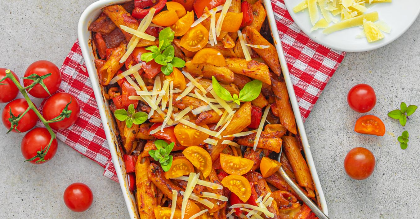 Těstoviny přemístěte do pekáčku vymaštěného olejem. Zapékejte 30 minut v troubě vyhřáté na 180 °C.
