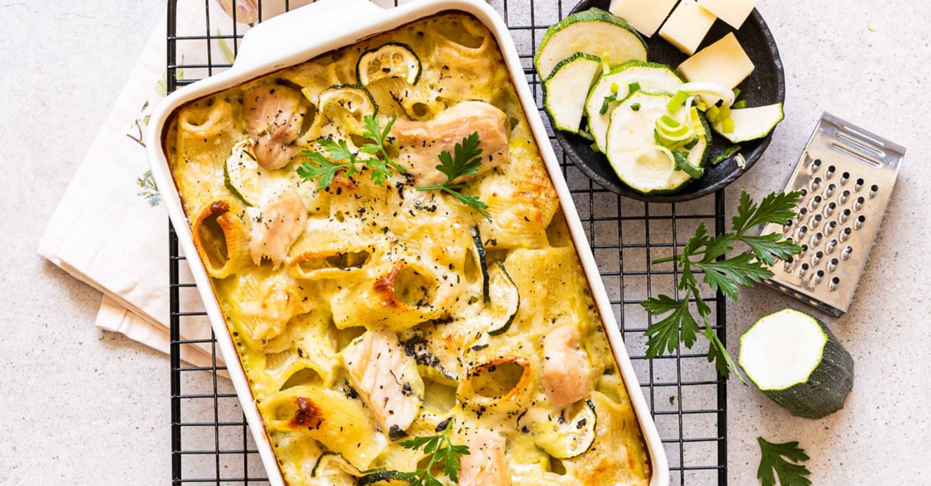 Zapečené těstoviny v cuketové omáčce s kuřecím masem