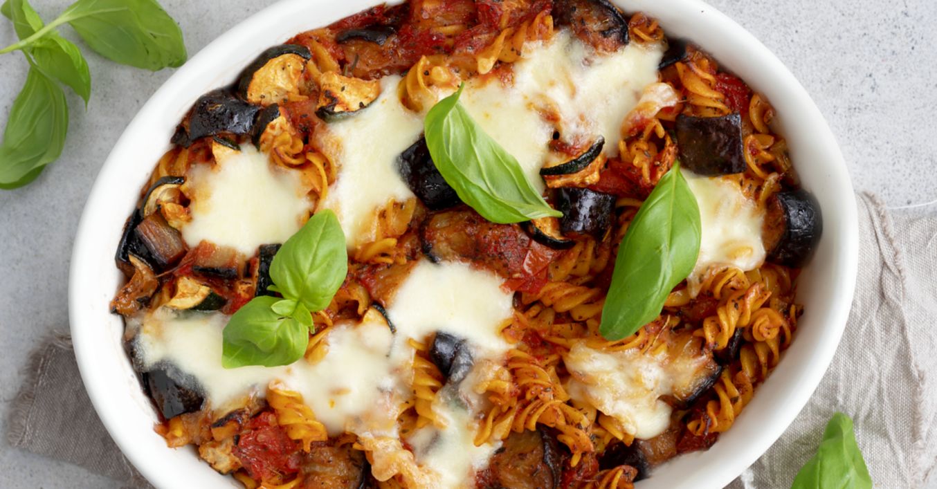 Směs promíchejte s těstovinami. Dejte do zapékací mísy a pečte 15 minut na 200 °C. Pak posypte natrhanou mozzarellou a pečte dalších 10 minut. Podávejte s čerstvou bazalkou.