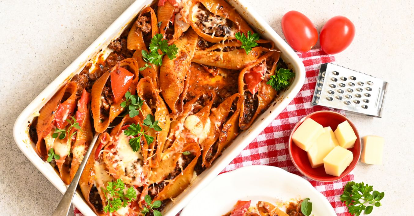 Zapékací mísu vytřete olejem. Na dno dejte trochu omáčky, zbytkem naplňte vnitřky uvařených těstovin. Ty rozložte do zapékací mísy.