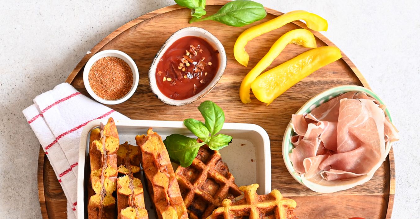 Vafle z jedné strany potřete rajčatovou směsí. Na ni dejte plátky slaniny a sýra. Přiklopte druhou vaflí a dejte zapéct do vaflovače.