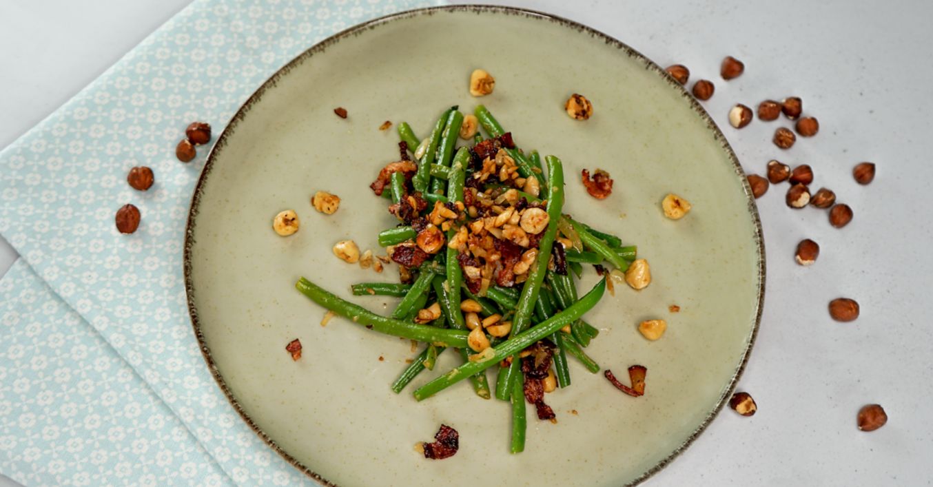 Vyndejte slaninu z pánve a na výpeku si ještě opečte nasekané lískové oříšky dozlatova.