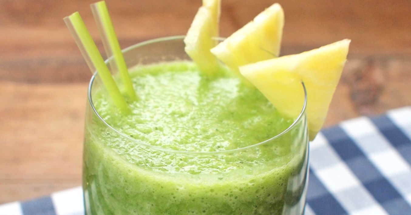 V mixéru rozmixujeme jogurt, ananas a špenát s kostkami ledu. Podáváme do vysoké sklenice s brčkem.