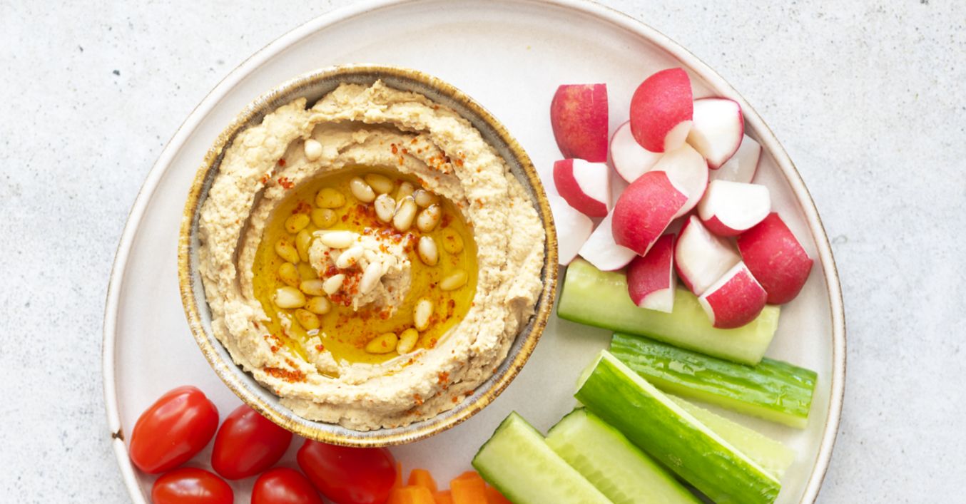 Hummus dejte do misky a zakápněte olejem. Ozdobte piniovými oříšky a mletou paprikou. Podávejte se zeleninou.