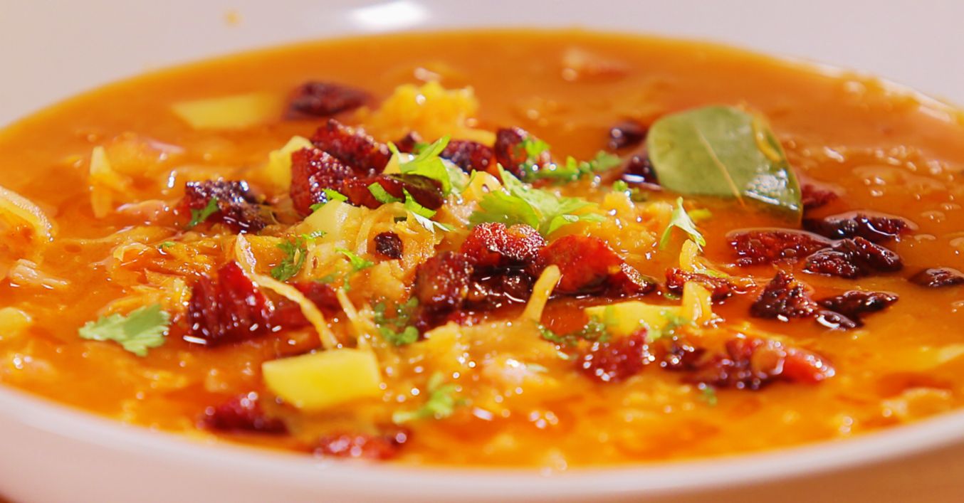 Zelňačka s uzeným masem a restovanou klobáskou