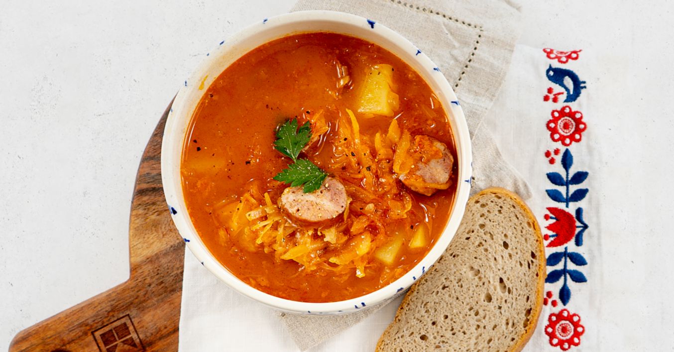 Přidáme scezené zelí, zalijeme vodou a přivedeme k mírnému varu. Brambory oloupeme, nakrájíme na kostky a také přidáme do polévky. Osolíme a vaříme do změknutí. Na konci přidáme na kolečka nakrájenou klobásku, necháme prohřát a podáváme.