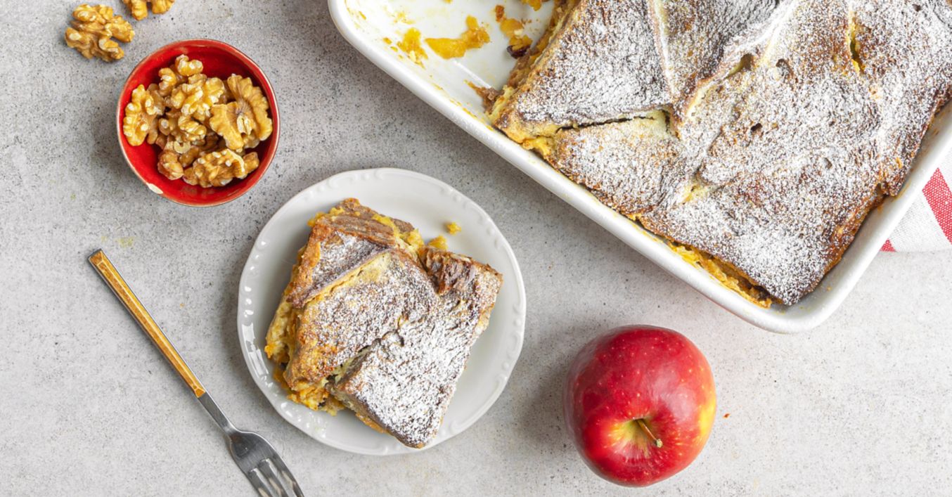Dno vymazaného pekáčku vyložte první vrstvou namočeného chleba. Na ni dejte orestovaná jablka, rozinky a pokrájené vlašské ořechy. Vršek přikryjte druhou vrstvou namočeného chleba.