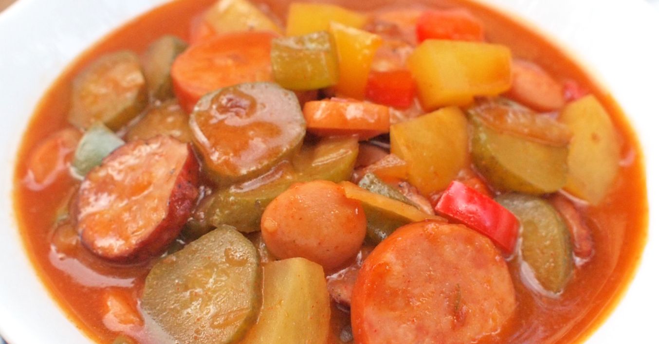 V hrnci rozehřejeme sádlo, přidáme cibuli a opečeme ji dozlatova. Přidáme klobásku, papriku, párek a vše spolu orestujeme. Přidáme papriku a promícháme.